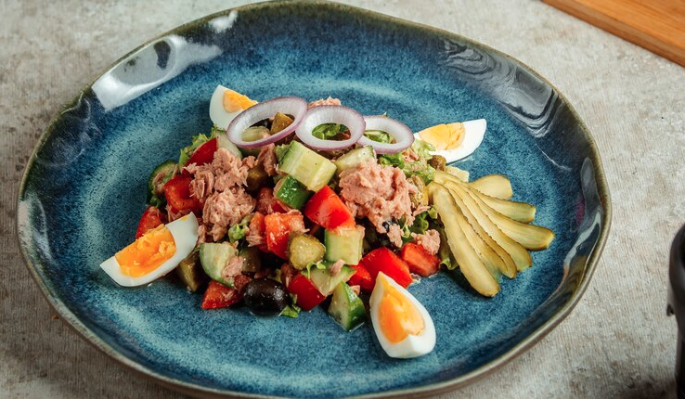 Салат олицетворяет средиземноморскую кухню и идеально подходит для легкого обеда или ужина. Ключевым ингредиентом является тунец, который в идеале должен быть обжарен снаружи до золотистой корочки, оставляя при этом нежную и сочную сердцевину практически сырой.