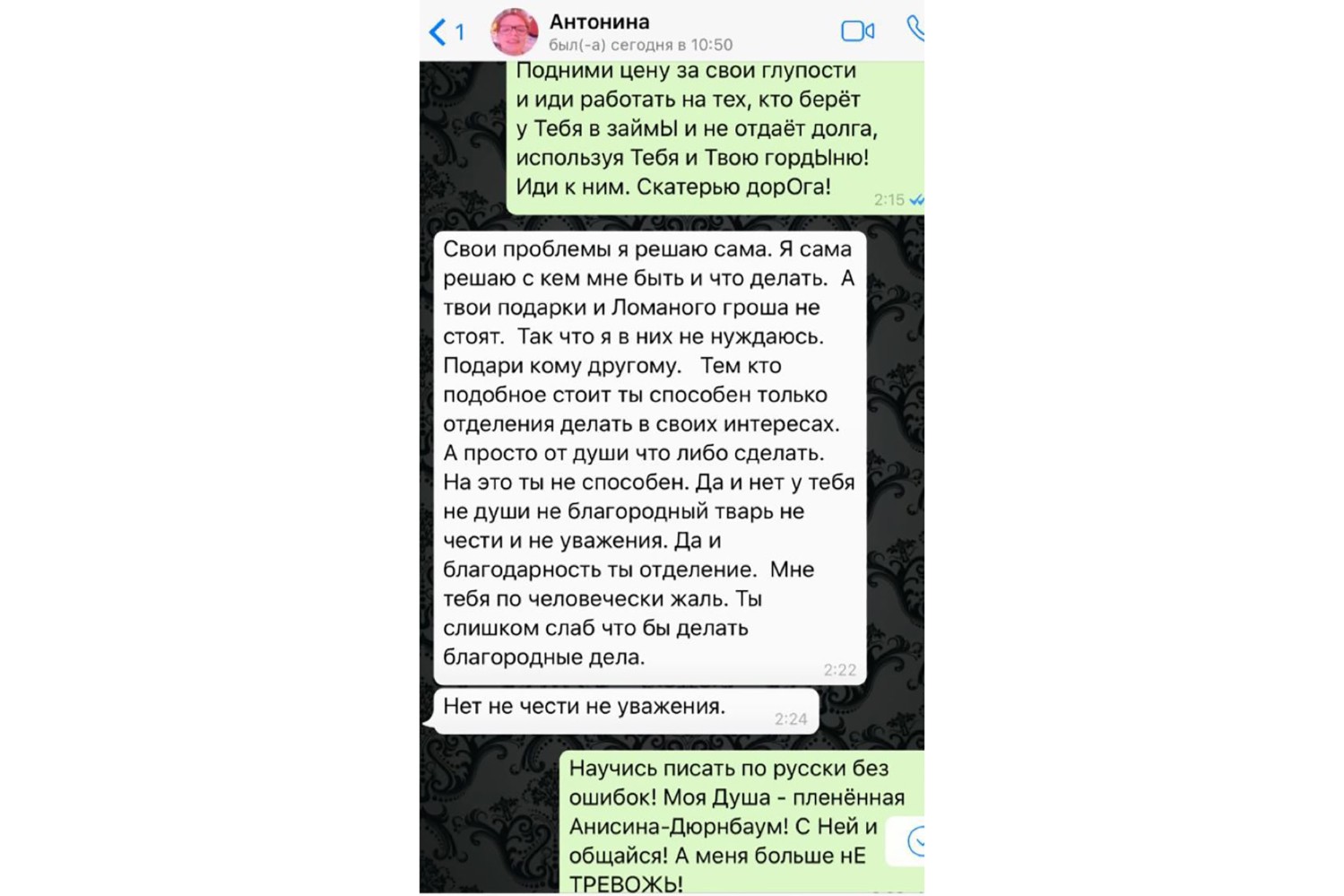 "Свои проблемы я решаю сама, – заметила Антонина. – Я сама решаю, с кем мне быть и что делать. А твои подарки и ломаного гроша не стоят. Подари их кому-нибудь другому... Ты слишком слаб, чтобы делать благородные дела". Артист же посоветовал бывшему директору научиться грамотно писать и сообщил, что больше не желает иметь с ней никаких дел.