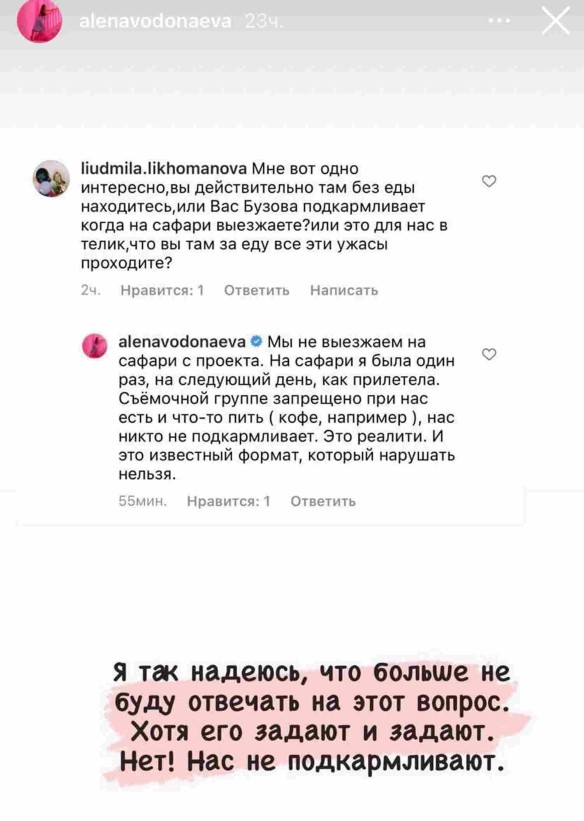 Эти слухи опровергла Алена Водонаева, которая приняла участие в новом выпуске программы. Она опубликовала в сторис своего "Инстаграм" комментарий подписчика, который предположил, что ведущие подкармливают звезд, когда те выезжают на сафари. Звезда "Дома-2" заявила, что съемочной группе запрещено пить и принимать пищу при участниках. Так, они даже не могут выпить кофе, когда на них глядят голодные артисты. "Это реалити", – заключила журналистка. Также она подчеркнула, что этот формат нельзя нарушать.